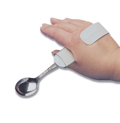 An excellent eating aid for people who have trouble grasping and holding small utensils * Utensils simply slide into the clear plastic sleeve * Spring-action plastic clip fits the hand snugly without pinching *