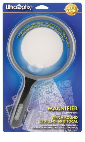 5 round handle * 2x power lens with 5 bifocal * blister carded * Hi-Power optical quality lens with bifocal insert * Unbreakable and scratch-resistant * For reading small print contracts telephone directories stock listings maps and charts stamps and coins *