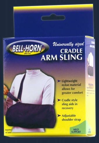 Traditional cradle arm sling in an adjustable universal design to fit most patients * Easy fast and simple application with D-rings and velcro-style closures * Made of nylon/cloth * Lightweight nylon material allows for greater comfort * Cradle style sling aids in recovery * Adjustable shoulder strap * Supports the arm for recuperation from fractures sprains or surgery of arm or hand * 17 long * HCPC Code A4656